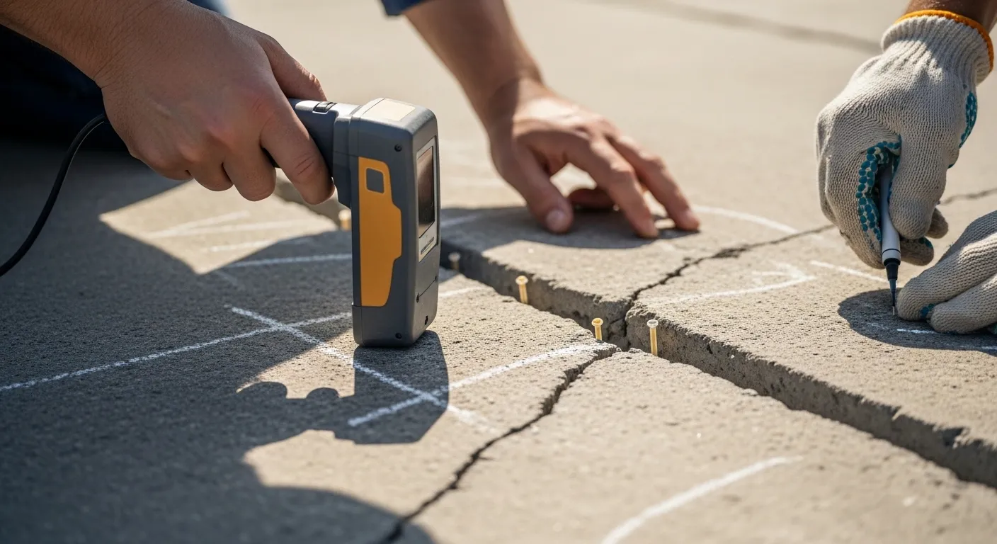 Structural assessment and remediation for existing concrete structures. Ground-penetrating radar tendon location, corrosion damage evaluation, crack repair via epoxy injection, external PT strengthening, and cathodic protection systems.